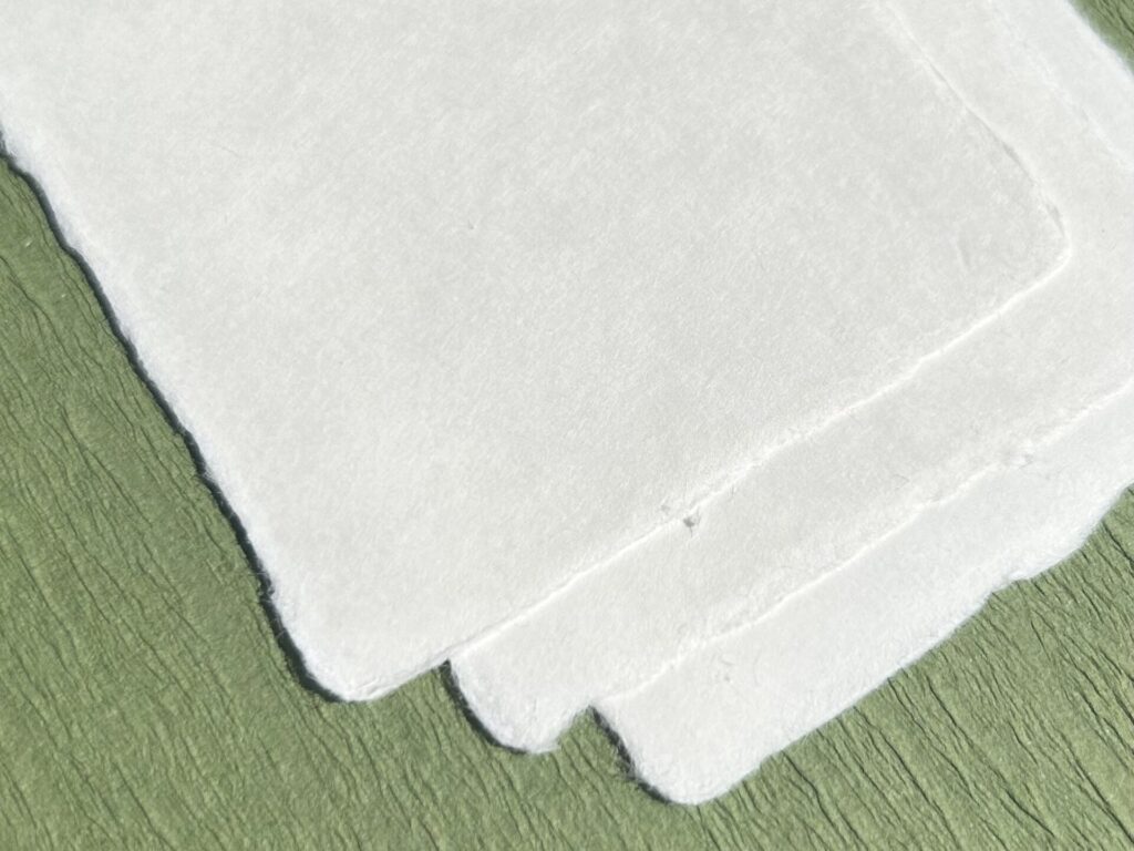 耳は手漉きの工程で繊維の自然な流れで生まれるものなので、1枚1枚形が異なります。大きな判で漉かれて刃物で切られたシャープな切り口とは異なり、「耳」は柔らかく緩やかな輪郭を作ります。小さな名刺のサイズで1枚1枚手間暇かけて漉きあげられたことが分かり、名刺に個性を与えてくれます。